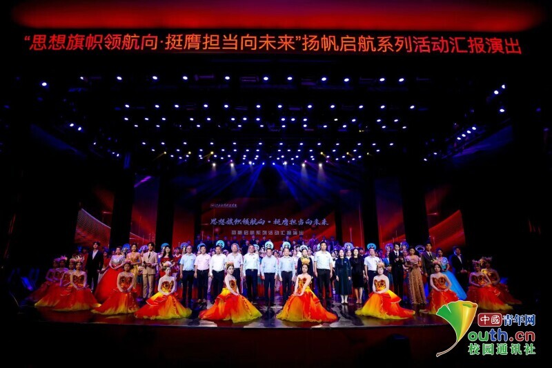 整台晚会激情飞扬,高潮迭起,歌声、掌声、喝彩声此起彼伏,汇成了一支欢乐、和谐的快乐交响曲。最后,校领导嘉宾与表演者合影留念,“思想旗帜领航向,挺膺担当向未来”扬帆启航系列校园文化活动汇报演出圆满落下帷幕。