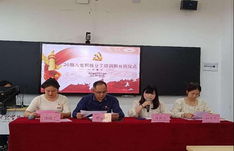 5月26日,现代管理学院分党校第26期入党积极分子培训班开班仪式顺利举行。出席开班仪式的有:学院党总支委员、院长谢远健,教工支部书记、副院长漆圆方,党总支专职组织员唐晓宇,学生党支部书记钟杰平。学院党总支委员、各支部委员、机关党总支入党积极分子以及学院入党积极分子参加了开班仪式,仪式由唐晓宇主持。